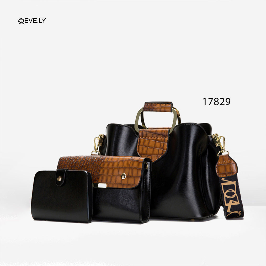 التصميم: طقم احترافي مكون من 3 قطع: حقيبة يد رئيسية، حقيبة "كلاتش" متوسطة بقلاب، ومحفظة يد صغيرة للبطاقات.