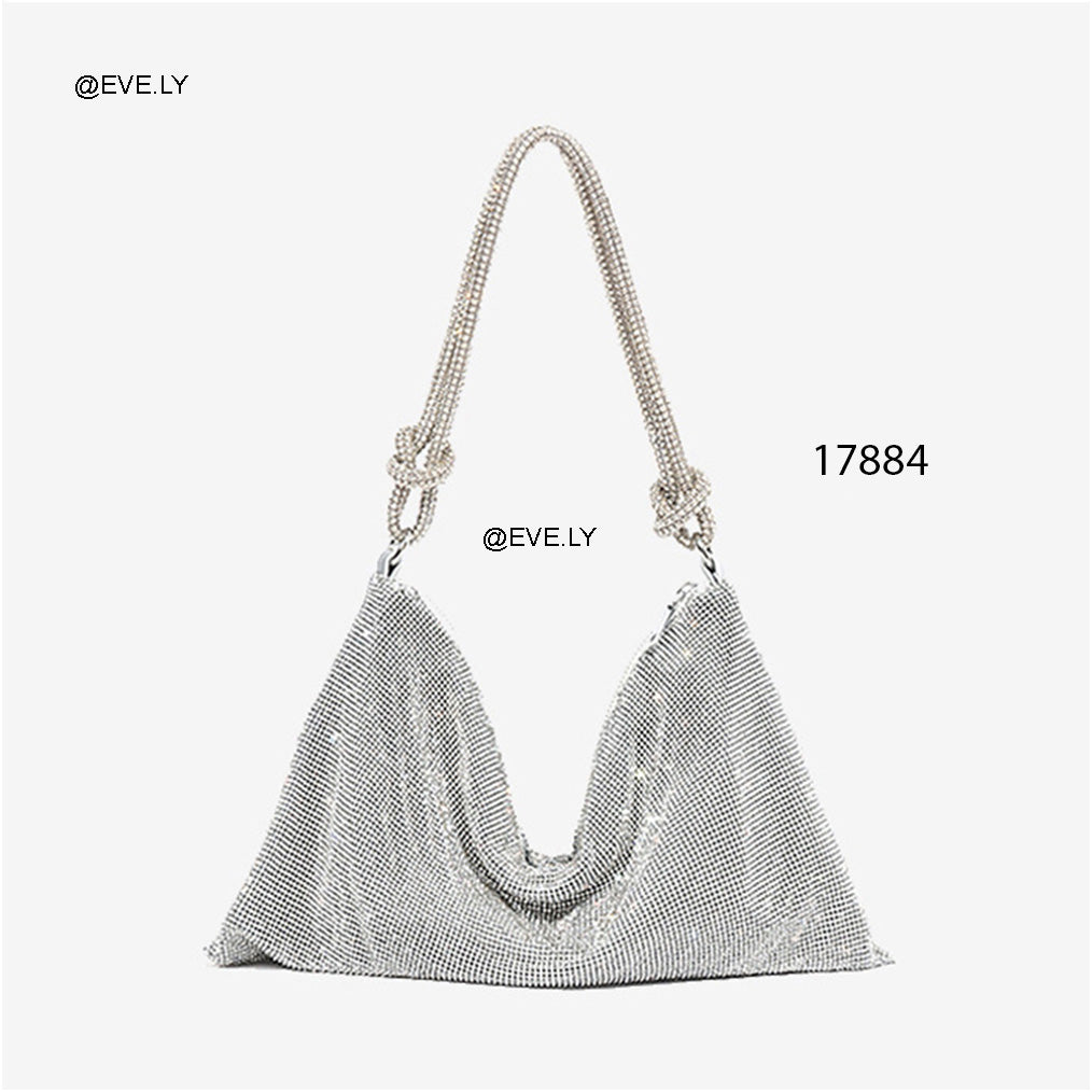 الخامة: قماش شبكي لامع مرصّع، بملمس ناعم ومرن، يمنح الحقيبة مظهرًا فخمًا وانسيابيًا.