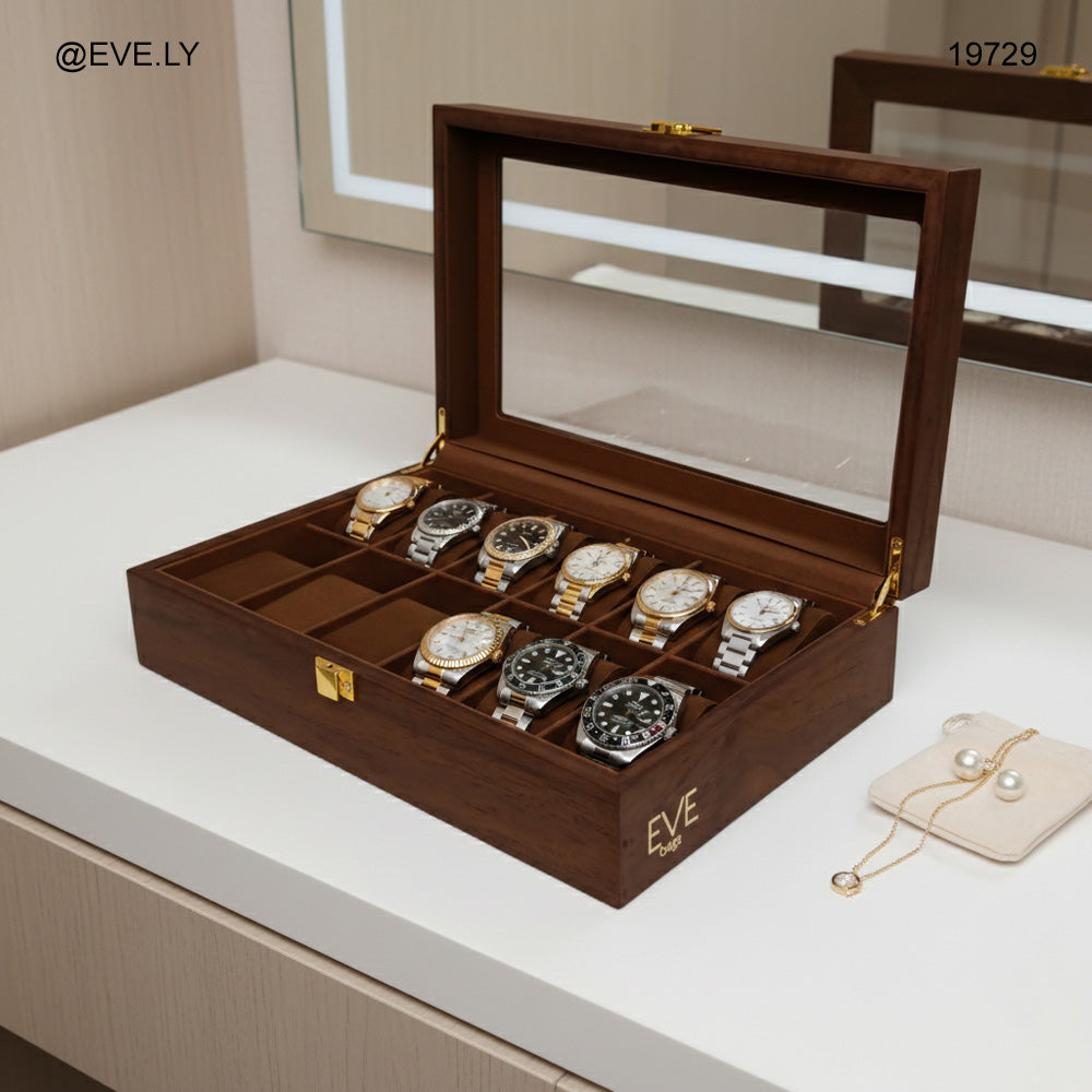 الواجهة: غطاء زجاجي عريض يتيح لك استعراض مجموعتك بالكامل بوضوح، مع قفل معدني ذهبي يضيف لمسة من الأمان والرقي.